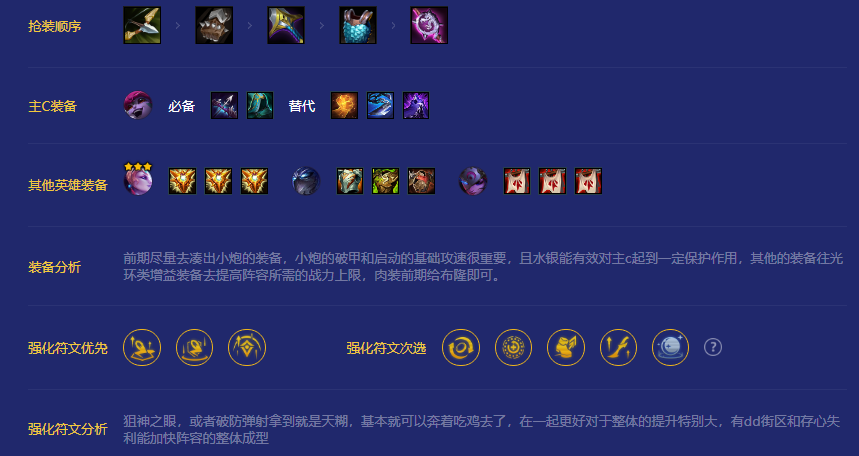前期尽量去凑出小炮的装备,小炮的破甲和启动的基础攻速很重要,且水银能有效对主c起到一定保护作用,其他的装备往光环类增益装备去提高阵容所需的战力上限,肉装前期给布隆即可。