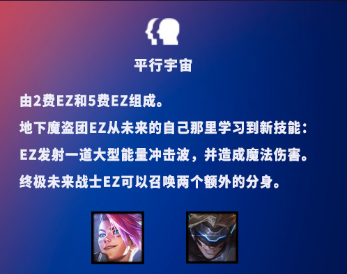 注:其实就是EZ同时作为2费卡和5费卡出现在S8.5,并且他们之间有羁绊,同时上场的时候两张卡的技能都会得到强化。