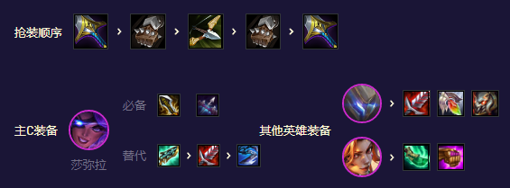 沙弥拉无尽轻语必备打伤害,科技枪一个是增加她的生存能力一个是可以给盖伦回血增加坦度。盖伦饮血救赎泰坦三见到能抗能打能恢复。出正常的龙牙反甲反而没有多大的作用。