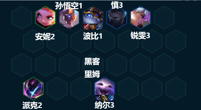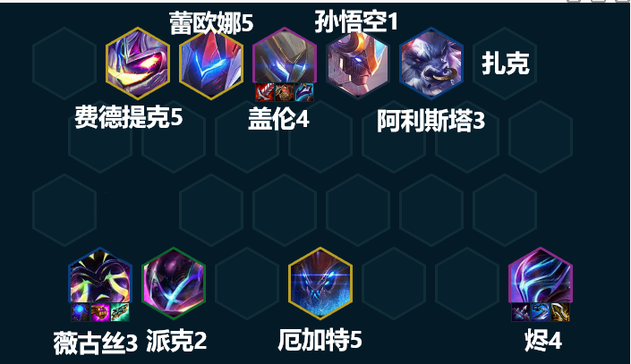 三至高天的效果是:召唤一个扎克,扎克会复制距离它最近的至高天单位的另一羁绊。烬的另一个羁绊是混沌战士、薇古丝的另一个羁绊是吉祥物、派克的另一羁绊是黑客。在这套阵容里,我们需要让扎克复制烬的混沌战士羁绊,方便我们开出3混沌战士。