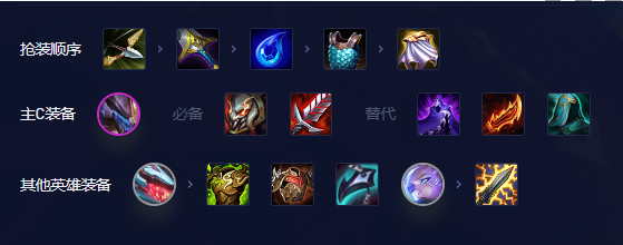 沃里克主C,不算太吃装备,泰坦最优越多越好,如果没有也可考虑鬼索,第二件件套续航装备,饮血剑最优主要是要其护盾,第三件建议夜之锋刃或水银,夜之锋刃能消除仇恨,水银更多是搭配鬼索快速叠加层数。其他输出装备无尽之刃、巨人杀手、破防者、死亡之刃等也都可考虑。