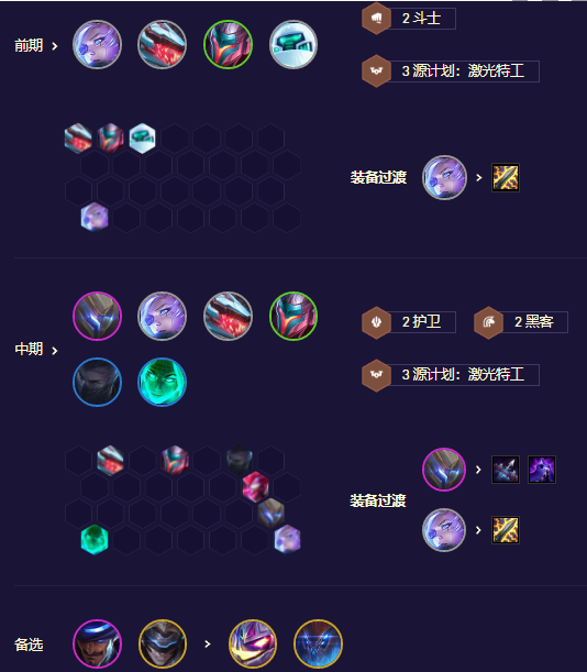 前期尽量用强势棋子与羁绊打工,保证打工棋子2星,进而稳定血量健康,步入7与8阶段,7与8阶段低费打工卡向以4-5费棋子为核心阵容转型。