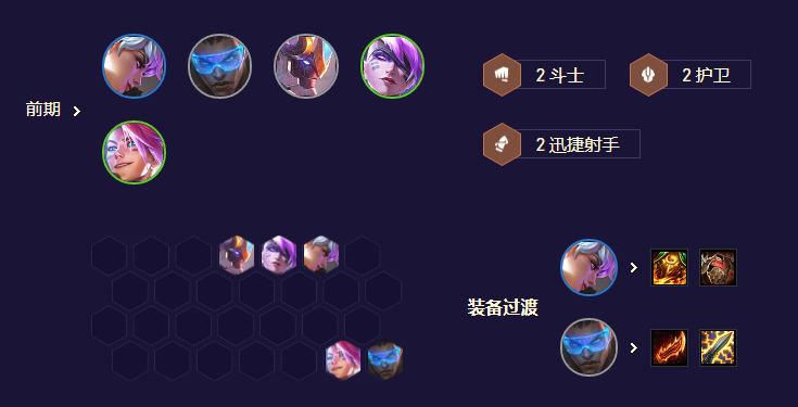 此阵容最好能打出连胜,如果前排嫖卡比较顺,前排有两个两星,后面输出也升两星的话,可以考虑6人口不用D排,直接上7人口D牌,D出女枪就阵容成型。如果前排连败的话就3-2拉6人口,一波大D,至少把阵容先D成型,4星守+瑞文+EZ,然后慢慢上7找女枪。