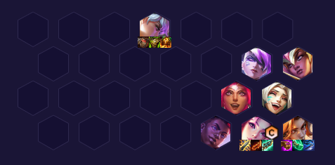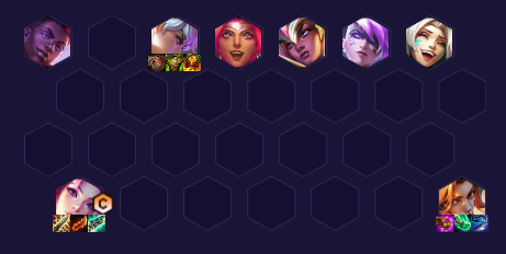 常规站位,带肉装的前排站卡莎同侧保证卡莎的输出环境,淘气包可以单顶前排的边角,可以第一时间被打出假人,增加队伍的坦度。