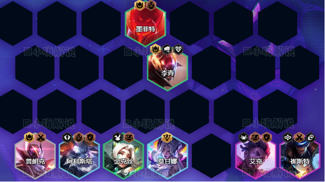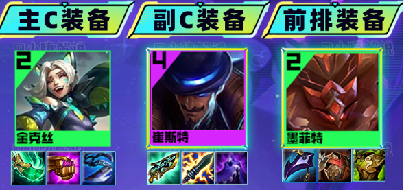4阶段:4-1/4-2阶段大搜3星金克丝>墨菲特=李青,金克丝3星就可以拉7人口,7人口补充艾克开出2淘气包羁绊。淘气包在4阶段非常关键,乐芙兰、纳尔基本开出3黑客羁绊跳后排,有2淘气包就能够保证金克丝不被秒。