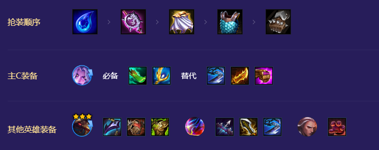 优先找到莫甘娜的青龙刀以及拉莫斯的反甲龙牙,随后补齐拉莫斯和莫甘娜的装备,佛耶戈带偷偷,烬负责捡多余的物理装备。