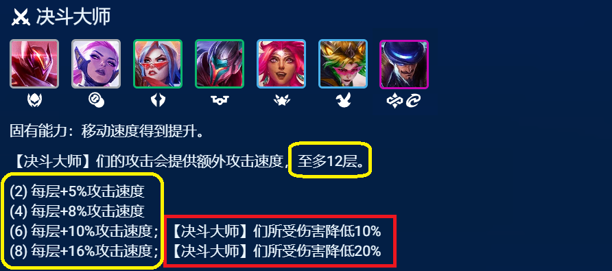 决斗这赛季强度其实是很高的,6/8决斗羁绊下这赛季决斗棋子增加了10/20%减伤,这样脆皮的决斗棋子们获得了较大的坦度提升,生存能力大大增强,更因为此这赛季高决阵容对钢铁烈阳之匣的需求不是那么高了,现在有一个就好。