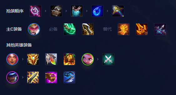 其他装备就不要等有啥合成啥,多余法强装备给崔斯特,多余坦度装备给菲奥娜或尼菈。