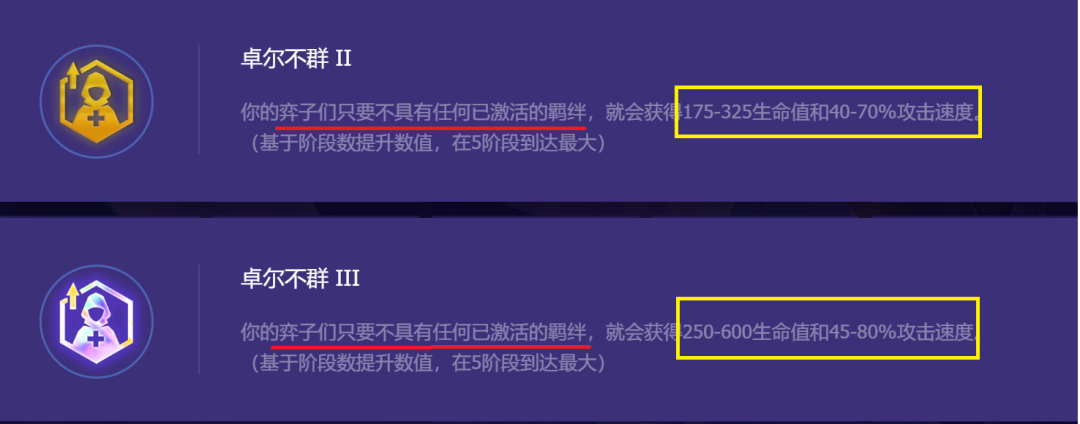 卓尔不群是上场棋子只要不触发羁绊就能获得增加攻速与生命值。并不是阵容不能有羁绊,如所有的怪兽棋子都无法触发卓尔不群,但上场不影响阵容其他无羁绊棋子享受卓尔不群的增益,在如精英羁绊只有在1或4羁绊的适合羁绊才能达成而2/3精英是可以享受到卓尔不群的收益的。