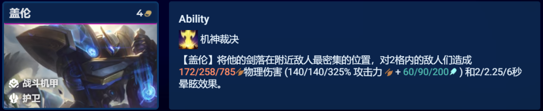 这样咱们前排只建议搭配盖伦,且技能控制范围大,这样能给后排棋子争取更多的输出时间。这也是这套阵容的一个关键,由于后期盖伦不可替换性较大,盖伦能不能2星对阵容强度影响很大。