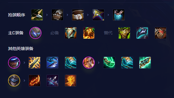 物理C位可考虑莎弥拉或终极伊泽,出装上莎弥拉必备轻语+飓风,终极伊泽必备鬼索/朔极之矛+轻语,第三件看情况选择输出装都可巨人杀手、破防者、正义。