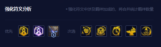 强化符文方面卓尔不群(必备,不要银色的)、组件百宝袋(多C位装备成型更容易)、好事成双(极大幅度提升阵容强度)、飞升(15秒后的神)最优。