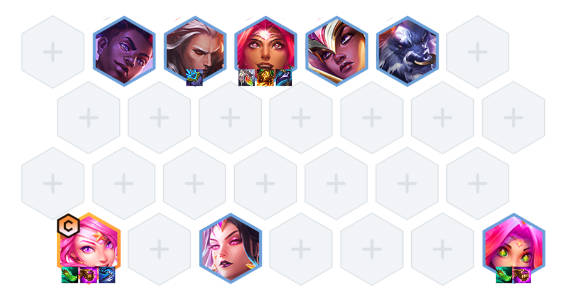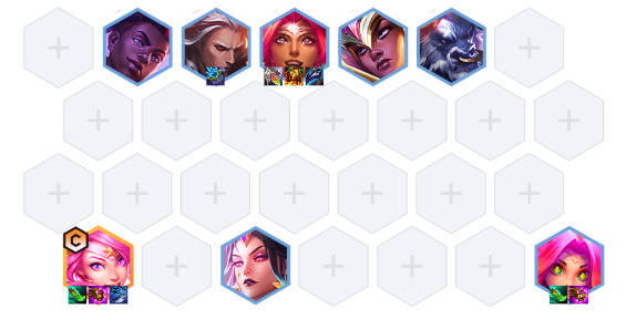 1、阵容组成:拉克丝+尼菈+妮蔻+佛耶戈+辛德拉+艾克+阿利斯塔+芮尔。