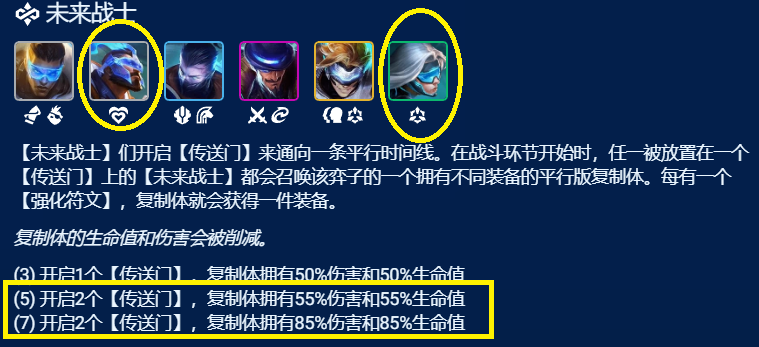 单看希维尔输出其实只是一般偏上,但搭配上5/7未来羁绊阵容强度就能获得史诗级提升。5未来就能召唤出两个复制体,通常选择潘森与希维尔,且未来召唤出的在3个符文后复制体就能携带3件契合的装备。召唤出的希维尔很多时候攻击力是比希维尔还高的,输出同样爆炸。而前排还能多召唤一个3装备的潘森,有装备哪怕被削弱45%生命值的潘森,也能抗很久,大幅度的增强了阵容的坦度。但不建议在未来两个格子都是前排的时候玩,有未来转职除外。