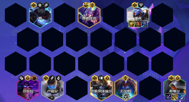 如果3-1搜3次卡不顺利,则直接考虑拉6人口,慢追3星潘森和希维尔即可。3星2神肉装潘森是在3阶段连胜的关键,第一个未来格一定要给潘森站!