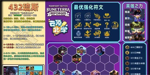 美测刚开始前厄斐琉斯这套只需要开2亡射即可,但是厄斐琉斯目前被连续砍了好几刀,反而厄加特被多次加强。如果只靠厄斐琉斯输出,阵容强度是不够的。我们团队经过多把测试,厄加特现在不仅能够充当副坦还有不俗的爆发伤害,常常一个技能冲到对手后排搅局。所以目前来说开4亡射是比较合理的。因为阵容前排的技能基本上都是和护盾有关系,所以阿北选择了开3巨神峰羁绊提高前排坦度,如果大家在实战中觉得阵容坦度够了,也可以下奶妈上冰女开3弗雷尔卓德,提升阵容的控场能力。