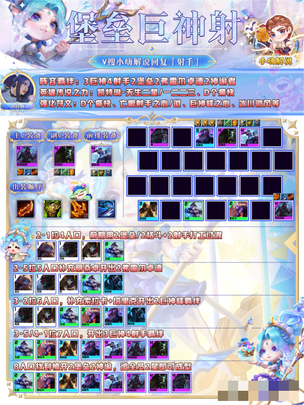 2.有3巨神羁绊的情况下,厄加特和前排的坦度能够直接拉满,后期有厄斐琉斯补充伤害,容易在4、5阶段清理没成型的D卡流阵容。