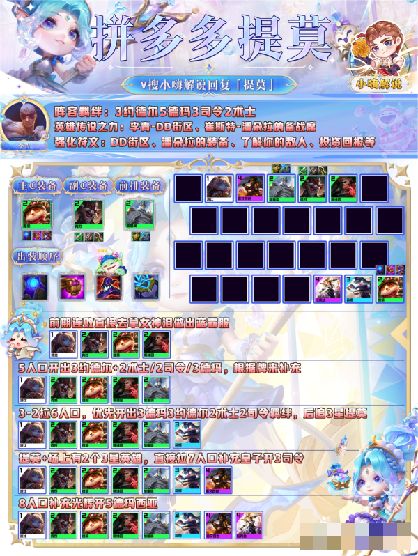 提莫的装备是必备蓝霸服,其他装备就是无脑堆输出装,可以考虑做一个海克斯科技枪刃,在没有回复的情况下,能够让提莫保命。前排坦克谁先3星谁来肉,核心装就是肉装+离子火花,没有离子可以考虑做电刀。娑娜只管无脑堆圣杯,给提莫加法强即可。