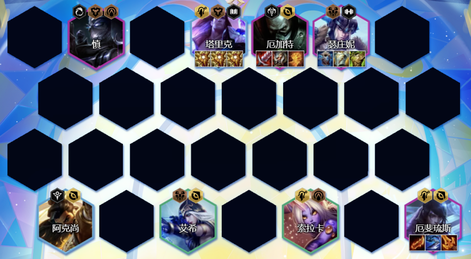 阵容组成:艾希、索拉卡、塔里克、阿克尚、厄斐琉斯、慎、瑟庄妮、厄加特