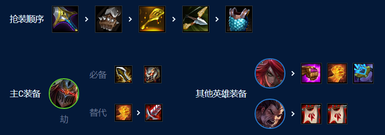 劫必备泰坦无尽,第三件吸血装,饮血容错高,正义爆发高,然后做1到2个棋子提升启动,下来就是卡特的装备,法爆正义离子,要是有裁决转也可以给卡特换离子很强。