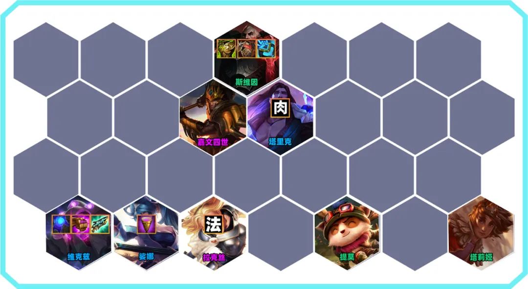 6人口斯维因、塔莉娅、提莫、塔里克、娑娜、维克兹组成4术士3法师2司令