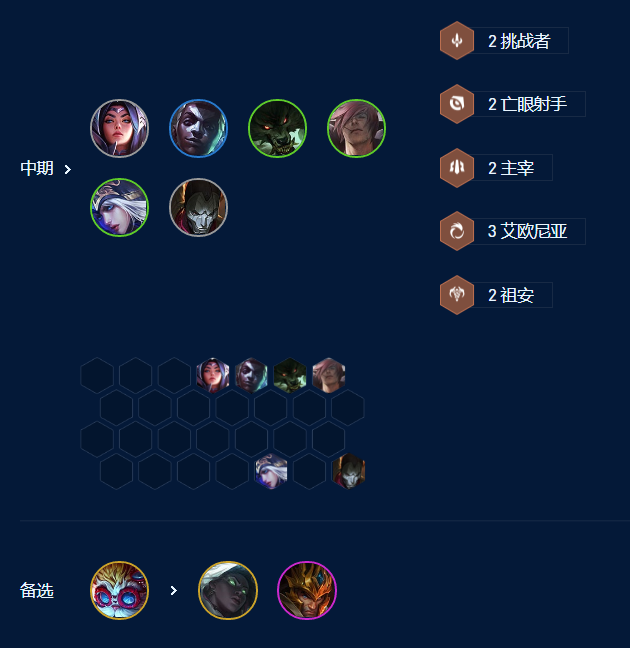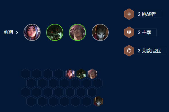 开局推荐,3艾欧2挑战过度,稳血为主,这套阵容很适合拿奥恩装备打连胜。