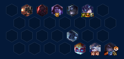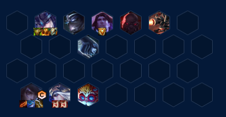 跟大部分的运营阵容节奏差不多,2、3阶段拉人口打连胜、4-1上7人口大搜一波,开出弗雷和射手,补出一定的质量就可以存钱上八人口,上八找塞恩和大头。大头可以弥补没有重伤还能用升级维修工具,让炮台当前排,增加阵容坦度。如果没有大头,用塞纳也可以。