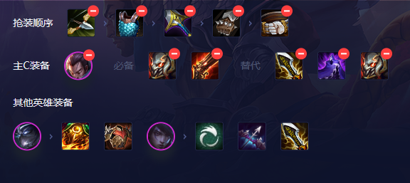主坦慎,只出2个坦度装备就可,建议日炎有重伤,在敌方多前排或是高续航阵容的时候能辅助双C快速击破,第二件建议荆棘背心或救赎。