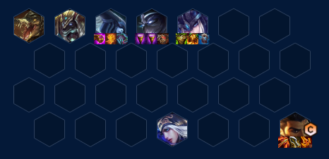 2阶段以3艾欧为中心,补沃里克开2主宰2挑战,后排找个长手AD单位带装备,优选2星莎弥拉>2星烬>2星崔丝塔娜