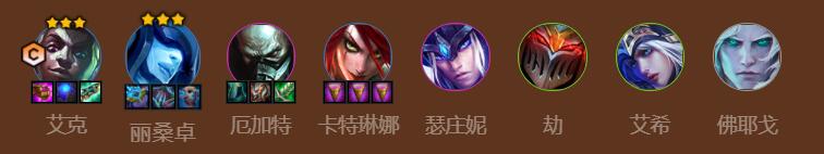 阵容推荐:艾克,冰女,螃蟹,卡特,猪妹,劫,寒冰,佛耶戈