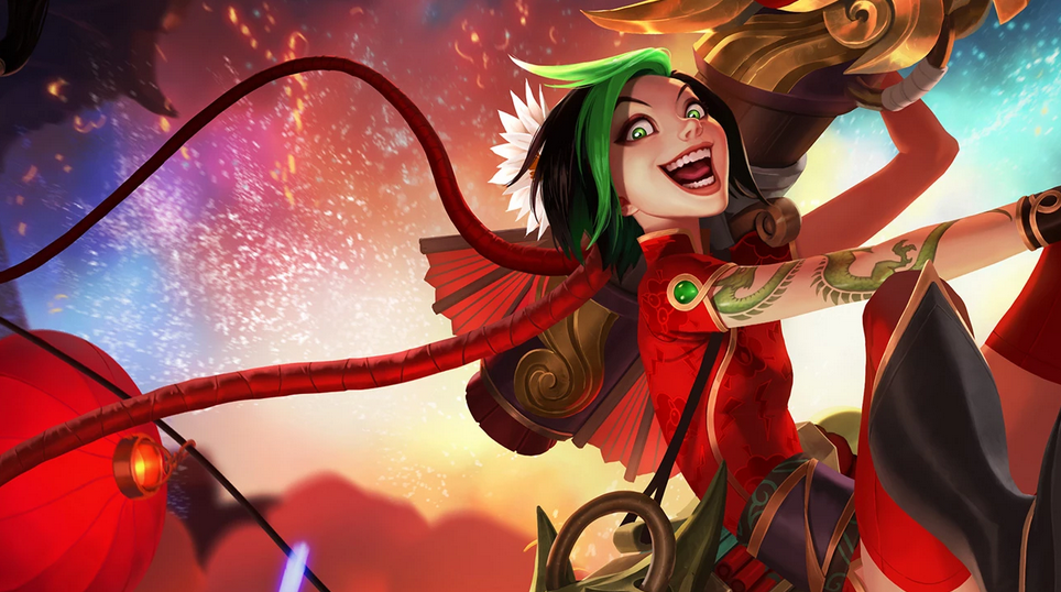 被动:【金克丝】在参会与击杀敌方单位后会获得罪恶快感! 在她首次参与击杀后,她会获得50%/70%/100%额外攻击速度。 在她第二次参与击杀后,她会切换成导弹发射器,对目标及目标身边小范围内的所有敌人造成125/200/1000额外魔法伤害。