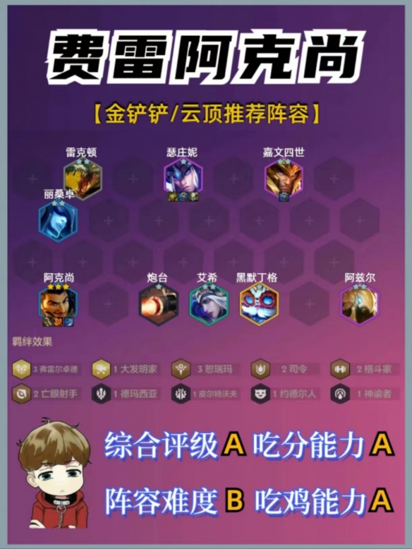 这套阵容在JOC3比赛中多次夺得榜首,要注意的点:没来阿克尚之前阵容强度略低,要注意控制血线,必要时梭哈寻出二星阿克尚即可锁血,剩下棋子可白嫖至大成,(比较怕突脸艾克)强度可观。