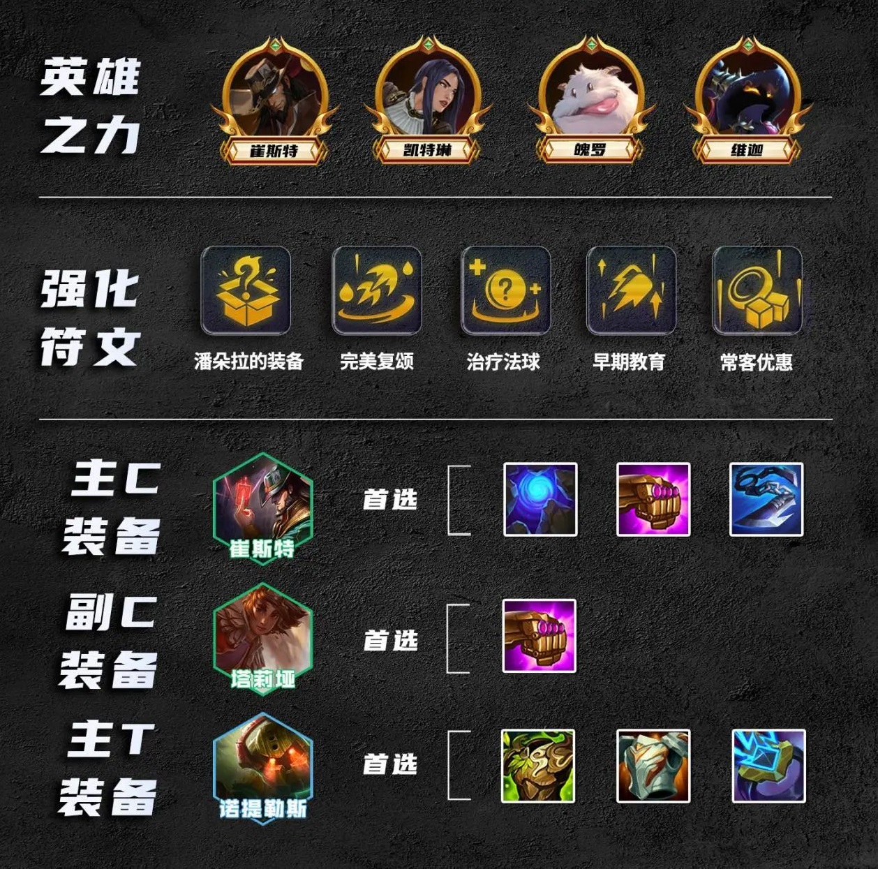 英雄之力建议选择崔斯特,由于阵容比较吃前排装备,可以说对装备要求较高,非常建议拿崔斯特第1个符文潘朵拉的装备,