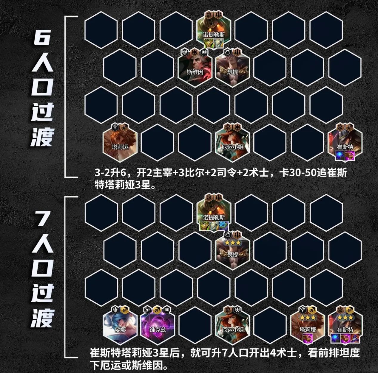 3-2升6人口,可大搜卡,开2主宰+3比尔+2司令+2术士羁绊,之后看节奏卡着30-50金币追崔斯特与塔莉娅3星,顺带可追瑟提三星。