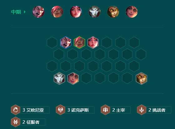 二、阵容羁绊:4 征服者3 艾欧尼亚3 诺克萨斯2 弗雷尔卓德2 主宰2 格斗家
