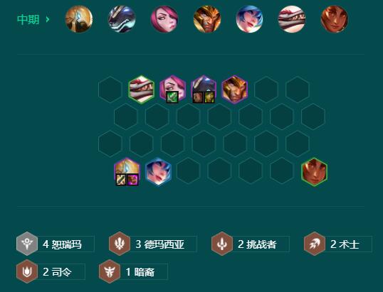 二、阵容羁绊:2 暗裔、4 恕瑞玛、3 德玛西亚、2 主宰、2 挑战者、2 术士、2 司令