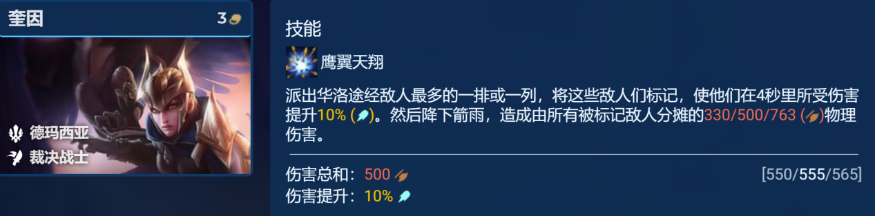 而阵容的的主c奎因,在给予德玛西亚精锐后能获得一件免费的光明装备(光辉之刃),能大幅的的增加攻击力,特别是奎因在3星后搭配轻语+无尽之刃+光辉之刃后攻击力能达到310,释放技能就可造成一个1700+的物理群伤,技能暴击伤害会更高,而阵容还开了4裁决战士羁绊还能为他提供的20%的额外伤害,其技能在被标记的敌方4秒内还会再多承受10%的额外伤害,奎因在多重属性的加持下,输出非常恐怖。