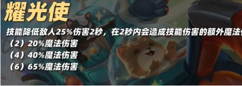 1、耀光使:技能降低敌人25%伤害2秒,在2秒内会造成技能伤害的额外魔法伤害。