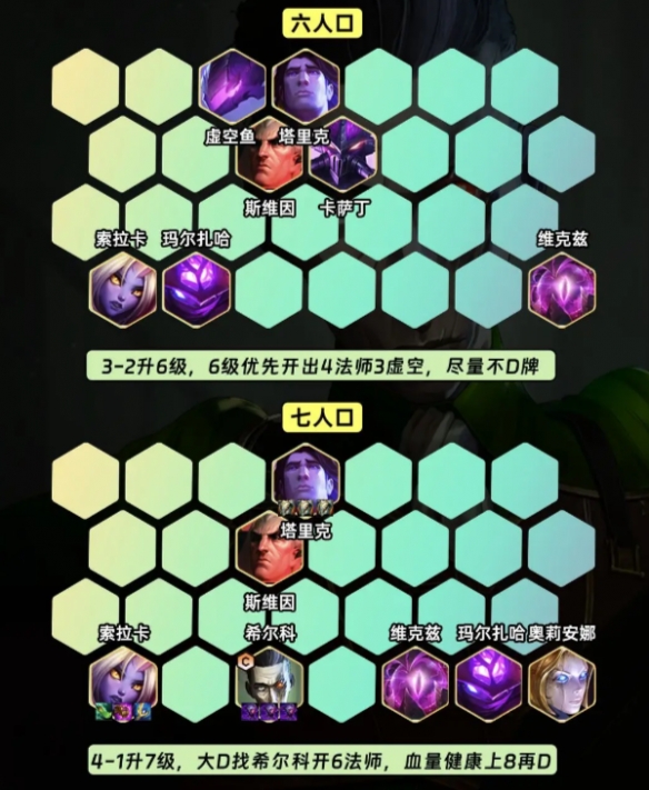 3-2升6级,6级优先开出4法师3虚空,尽量不D牌