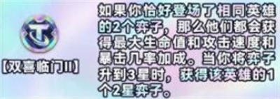 登场相同英雄的2个奔子,会获得最大生命值和攻击速度和暴击几率加成。