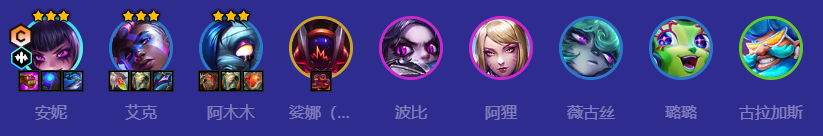 安妮、艾克、阿木木、娑娜、波比、阿狸、薇古丝、璐璐、古拉加斯