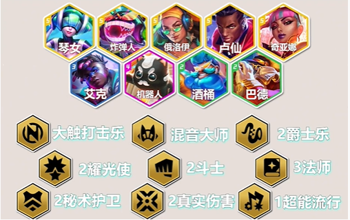 1大触打击乐、1混音大师、2爵士乐、2耀光使、2斗士、3法师、2秘术护卫、2真实伤害、1超能流行