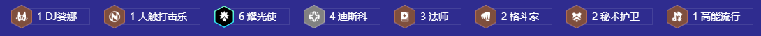 1DJ娑娜、1大触打击乐、6耀光使、4迪斯科、3法师、2格斗家、2秘术护卫、1高能流行