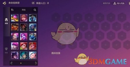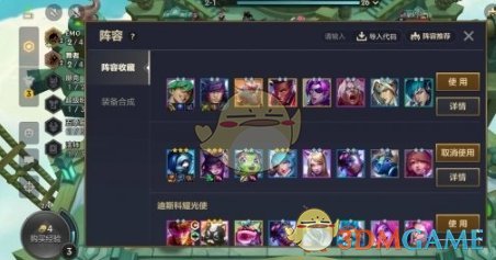 新建阵容进入到阵容编辑界面,左上角可以看到一个导入代码,这里直接点击就会自动导入你复制中的代码,然后就可以看到阵容信息了,你还可以自己调整下,没问题点击保存即可,保存通常会因为阵容数满了,大家基本没开月卡就只有三个阵容位,你要替换掉一个你不用的阵容就行。