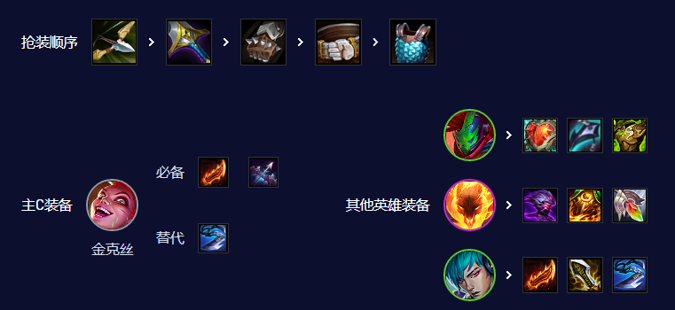 优先做金克丝的轻语和前排装备,前排有2件后再去做金克丝的三神装