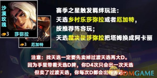 3、4-1拉7,卖掉过渡天选。大D找出基础阵容以及2星莎弥拉、2星厄加特赛季之星找乡村莎弥拉或厄加特,然后慢D这2张卡3三星。