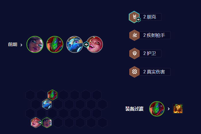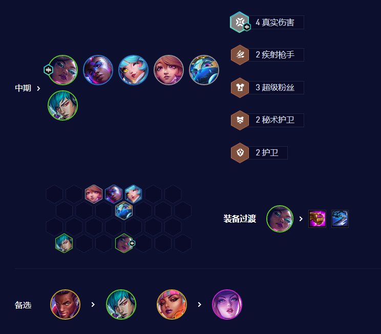 中期强度极高,比较害怕同行和一些后期九五的阵容,比较克制近战前排较多的阵容。后期疲软。需要五费卡补充强度