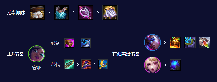 赛娜法爆必备,第二件任意输出装,第三件超级粉丝给青龙刀(改版后给纳什,需要自己出青龙刀)艾克半肉辅助装,狐狸妮蔻捡多余肉装