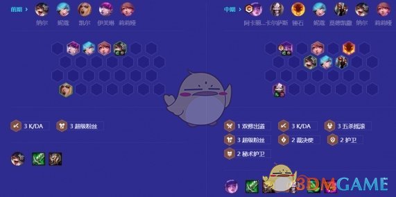 阶段2至阶段3-2,尽量走连胜,装备优先和汲取剑和泰坦,用纳尔带阿卡丽的装备打工最优,凑3超级粉丝3五杀摇滚,可以无压力、高血量过渡到阶段4。
