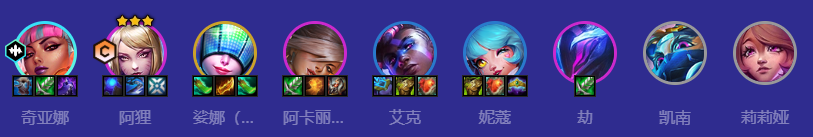 奇亚娜、阿狸、娑娜、阿卡丽、艾克、妮蔻、劫、凯南、莉莉娅